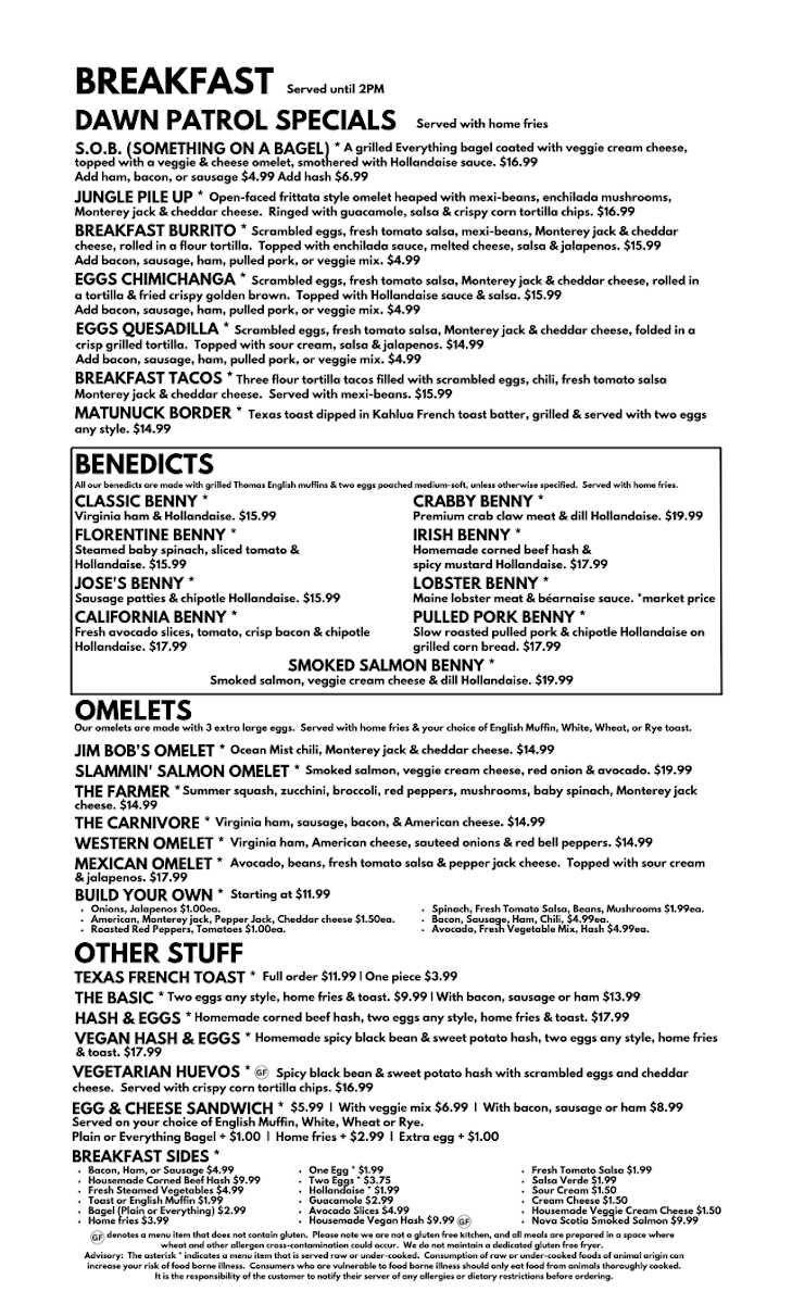 start with the eggs and go from there! you choose a regular or egg white base for 6.25. then decide how you would like to fill it. add 0.50 for onions, peppers, olives or jalapenos. add 0.75 for american cheese, cheddar cheese, monterey jack, mushrooms, enchilada mushrooms, spinach, roasted red peppers, salsa, tomato or our veggie mix. add 1.25 for ham, bacon or sausage. let the creativity flow!