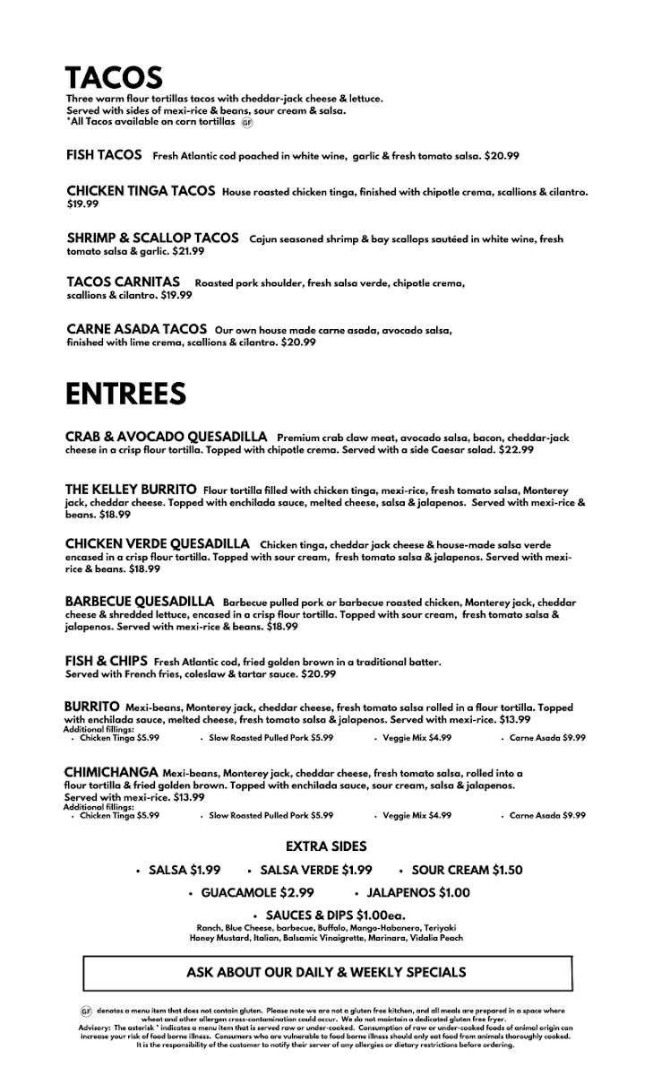 fresh local cod sauteed in white wine, garlic, homemade salsa, lime juice and cilantro. served in a three grilled flour tortilla with monterey jack, cheddar, lettuce. served with mexi-rice and beans.